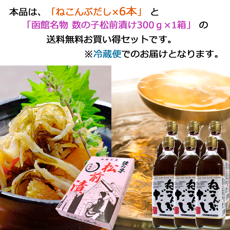 <送料無料・ねこんぶだし500ml×6本と数の子松前漬け300gのセット> ※原材料名等はPC商品ページ内でご確認いただけます。