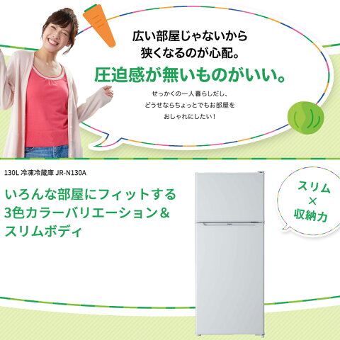 製品仕様 《 冷蔵庫 》 メーカー名 ハイアール(Haier) 型式 JR-N130B 本体質量 約29kg 年間消費電力量(50/60Hz) 239kWh/年 年間電気代目安 6,453円 2ドア冷蔵庫 各室容量 ○ 冷凍室:29L ○ 冷蔵室:101L 外形寸法 幅474×奥行495×高さ1128mm 据付必要奥行寸法 595mm ※設置条件により若干異なることがありますので、10mm程度余裕をとってください。