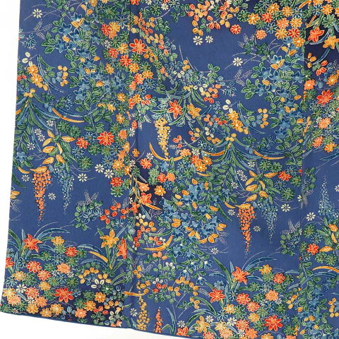上質なちりめんにブルー地と花の意匠でカジュアル用途にお召しいただけます。