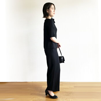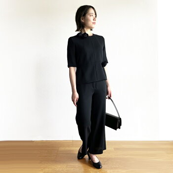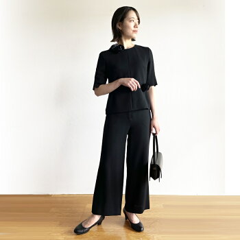 ウール100% ブラックフォーマル パンツスーツ ノーカラー ブラウス セミワイドパンツ レディース ビジネス パンツ スーツ ブラウス スーツ 黒 冠婚葬祭 喪服 礼服 セレモニー 卒業式 入学式 パンツスーツ 結婚式 ママ 二重織 強撚 ションヘル 日本製