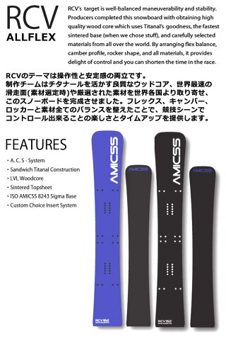AMICSS【RCV-ALLFLEX】 形状 キャンバー(キャンバー)ディレクショナル 滑走適正スタイル 1.レース 2.カービング 3.フリーラン (スタイルや技術によって変化します) コメント AMICSS snowboardは企画、設計、製造を日本国内工場にてハンドメイドにより丁寧に行っております。