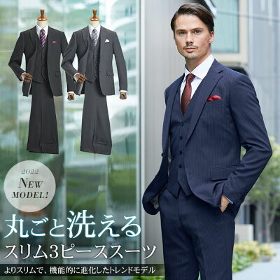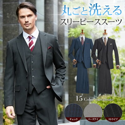 洗える スリーピーススーツ メンズ スリム 洗えるスーツ ウォッシャブル 3ピース 三つ揃いスーツ 2ツボタン ビジネススーツ メンズスーツ 2釦 ジレ ベスト付 ストレッチ 伸縮 オールシーズン対応 紳士服【送料無料】
